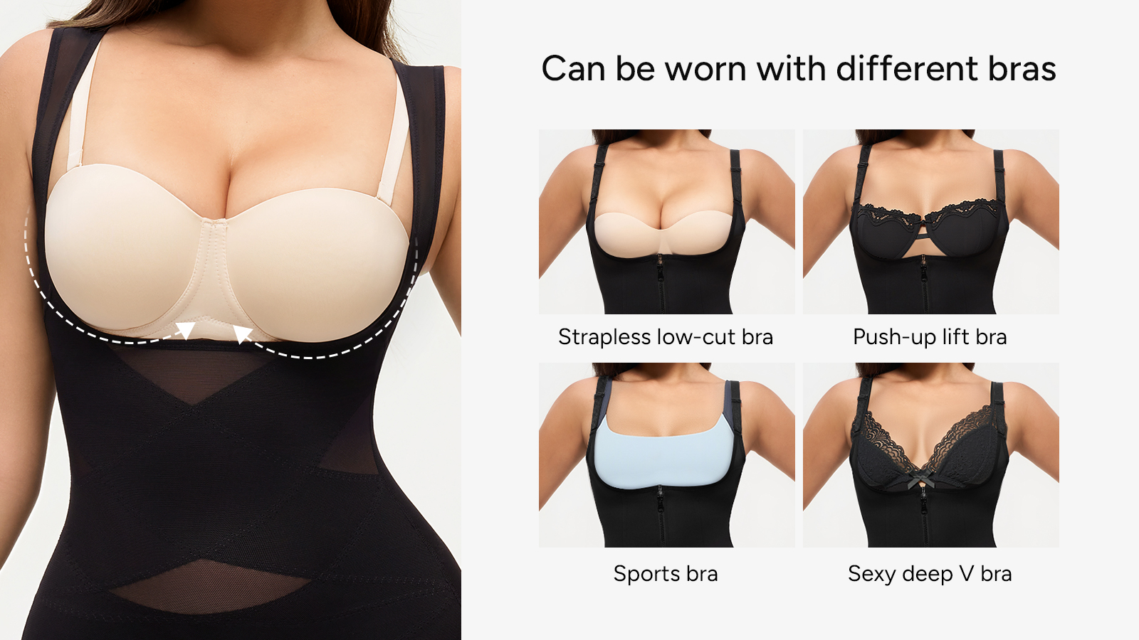 Another advantage of the open bust style is that you can wear your own bra. Whether it’s a daily comfort bra, a sports bra, or a lightly lifting bra, it can easily work with open bust shapewear.